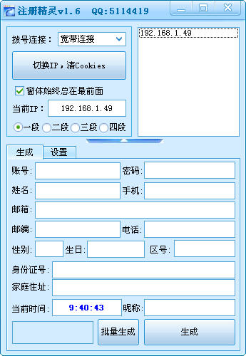 注册精灵是一款资料生成-姓名生成、手机生成、邮箱生成、昵称生成、身份证生成、地址生成、区号生成、邮箱生成、账号生成、密码生成、性别生成、姓名生成、换IP,强制粘贴功能,快捷键复制粘贴功能!