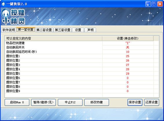 使用方法也很简单,按照按键精灵上的设置版块,将物品栏快捷键、开启换装和自动换回修改为自己游戏中所需的快捷键即可。