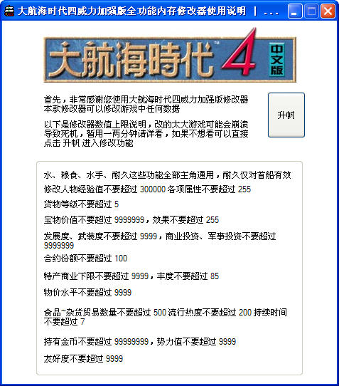 大航海时代4修改器大航海时代4威力加强版全功能修改器是一款大航海时代4修改器。大航海时代4威力加强版全功能修改器能修改游戏中的任何数据