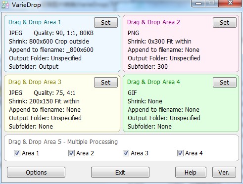 VarieDrop是一款图片转换器,能同时输出4种不同四种不同的配置,一个文件输出4种格式。该图片转换器提供了四个不同的设定区块,只要将图档拖曳进去之后完成了,第五个区域还可以指定多重处理,比一些右键转档软体还快速许多。