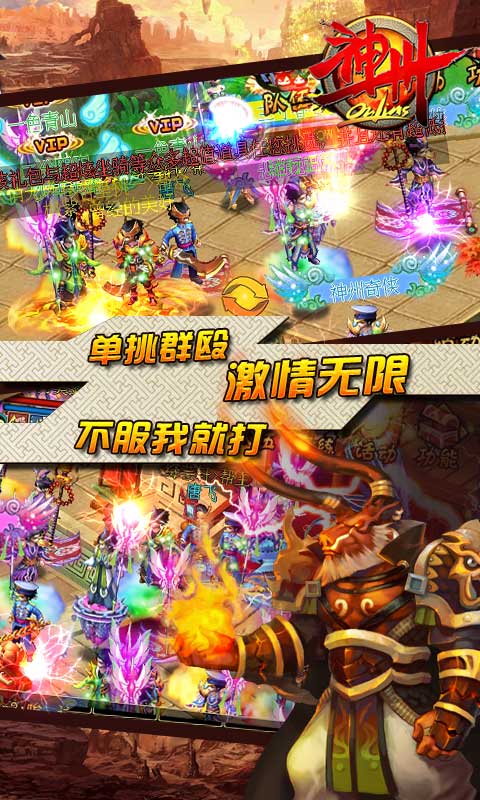 变种系统:玩家拥有各类无敌变种系统,分为:金、木、水、火、土五大属性10种爆犀利幻兽,百搭组合砍翻世界!群殴系统:擂台打不过,我就叫兄弟!颠覆擂台单人PK系统,可邀请好友为自己出气,通过群殴模式组队,打造最强神州战团!