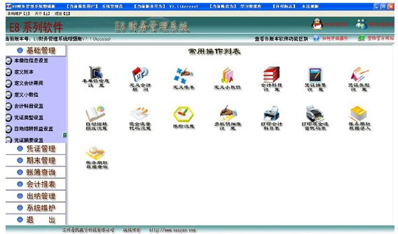 E8财务管理软件标准版符合我国最新会计制度,经过多年的(发)展和完善,现已成为业内最好的财务软件之一, 系统采用了“程序通用、用户专用”的设计思想,能个性化适应各行各业的需求,涉及建筑工业、工业、商业及机关事业单位等大量用户,充分显示了该系统广泛适应性。 E8财务管理软件包括凭证的编制、修改、审核、查询、打印。 软件自动登帐、结帐和计算产生各科目汇总余额。 软件自动生成日记帐、明细分类帐、总分类帐和多栏帐。可用不同格式进行综合查询、打印输出。 在报表编制中,可编辑管理各种会计表格,用户可以根据需要自行设计并打印出各类财务报表。报表编制功能具有极大的灵活性,系统预设了最新会计制度要求的标准财务报表,同时用户也可根据实际需要设计各种特殊报表。E8财务管理软件具有出纳管理功能,为出纳的帐务管理提供了及大的方便,其中的出纳会计对帐功能,更是减少了手工对帐中的种种不便,为出纳与会计的协调工作提供了方便。 E8财务管理软件属于多帐套多帐本管理软件,各帐之间相互独立,互不干扰。 具有跨月记帐功能, 当新的一月到来,而上一月又未结帐时,可直接进入新的一月。同时又提供了处理上月帐务的接口,从而保证了帐务处理的及时性和准确性。方便的会计科目及摘要短语维护功能,录入凭证时,可随时增加科目及摘要短语。 方便直观的辅助核算功能,用于满足不同操作习惯的人群。本系统采用图形导航,科学规范的业务流程,即使不懂软件的人,只要会点鼠标,按照提示只需录入凭证,各类帐簿及会计报表均是全自动生成。独特的通过普通宽带(如ADSL)连接远程数据库,轻松实现广域网(互联网)上数据共享操作,为用户节省巨大宽带租用费用。