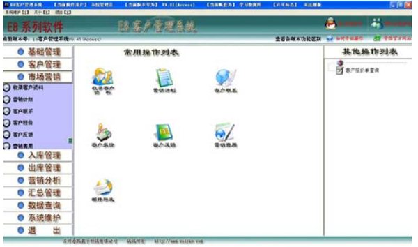 E8客户管理软件免费版基于先进的CRM营销理念设计,集客户档案、销售记录、业务往来、业务提成自动计算、邮件群(发)、营销费用记录、客户反馈记录等多种功能于一身,以凝聚客户关系、提升资源价值为核心,将潜在客户变为现实客户、从而提升销售量、提高用户的满意度,并增加企业竞争力。E8客户管理软件免费版采用图形导航,科学规范的业务流程,即使不懂软件的人,只要会点鼠标按照提示就能使用。查询汇总功能强大快捷,打印单据丰富,可以支持EXCEL数据导入、导出,E8客户管理软件免费版具有可以按客户、商品、业务员、部门等多种销售排行表的功能,及大的方便了企业销售决策。独特的通过普通宽带(如ADSL)连接远程数据库,轻松实现广域网(互联网)上数据共享操作,为用户节省巨大宽带租用费用。