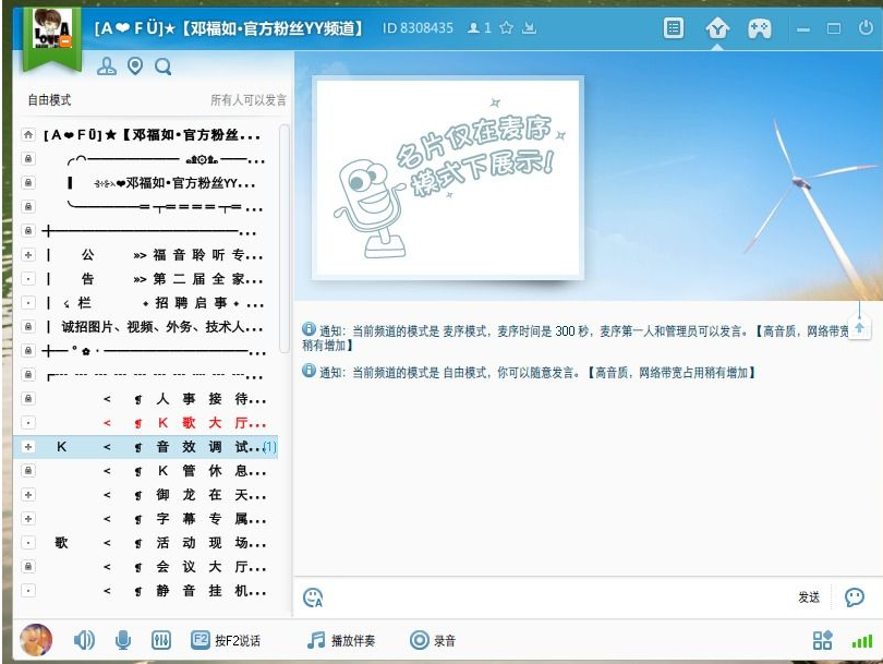 在YY频道里可以玩配音,管理员把配音素材放到基础公告里,设置为麦序模式。游客和会员们就可以和自己的搭档一起上麦玩配音啦!