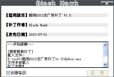 酷狗2012去广告补丁作者black hawk,是一款可以去除酷狗音乐2012版顶部广告条,去掉MV广告,今日推荐弹窗,去掉梦幻主题,发送到移动设备等按钮,去掉创建空白隐藏“KuGouCache”文件夹,去掉升级的工具。