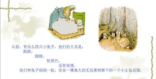 彼得兔的故事:从前,有这么四只小兔子,他们的大名是: 跳跳, 蹬蹬, 短尾巴, 还有彼得. 他们和兔子妈妈一起,住在一棵高大的无花果树脚下的一个小土包后面....彼得兔的故事由(英)毕翠克丝·波特著