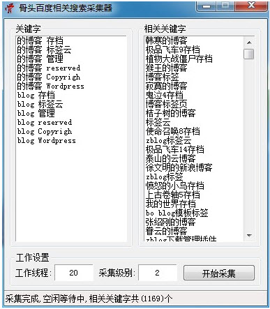 百度相关搜索软件骨头百度相关搜索采集器功能就是输入您的关键字以后自动去获取百度的相关搜索,百度相关搜索采集器也是骨头博客营销助手的最大帮手,如果您有需要不防试试哦.