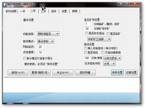 1、 打开辅助不要点“启动”,鼠标放在游戏中,按快捷键Ctrl+1,如果想停止请按 Alt+1,多开时请注意一下快捷键