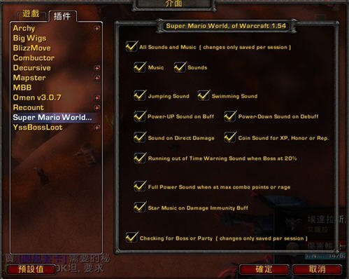 SuperMario超级玛丽魔兽世界插件是一款魔兽世界音效插件,使用该插件需先下载SDSPE超级音效包工具,一起装载才可正常使用。SuperMario超级玛丽魔兽世界插件可以在你的魔兽世界中加入超级玛丽的音效,包括更改背景音乐、跳跃音效、游泳音效等为超级玛丽中的各种趣味音效,让你在听惯了魔兽世界音乐之余,又能回味一下过去玩超级玛丽时那种轻松愉快的感觉。