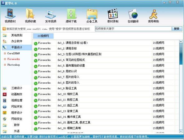 爱学教材全部采用flash格式的视频,其特点:体积小高清晰。目前内容涵盖:外语,数学,化学,物理,办公软件,平面设计,三维设计,动画制作,视频处理,web开发,程序设计,网络安全等视频教材。为方便用户快速查找与使用进行了细微的分类,