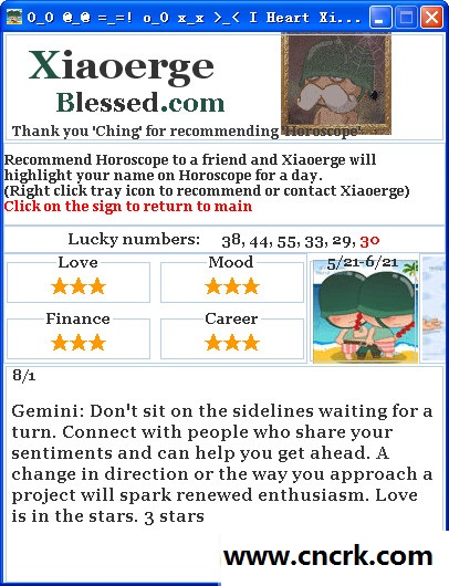 Horoscope是一款趣味小软件,能帮助互用进行星座运势查询。有了它,您不仅可以进行今日星座运势、每日星座运势、本周星座运势查询,甚至还可以查询2012年一整年星座运势。星座运势查询,帮助你预算星座的运势走向等