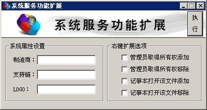 系统服务功能扩展是一个简单的小工具,包括系统属性相关设置和管理员取得所有权快捷设置;包括:windows vista以上版本系统属性相关、右键扩展管理员取得所有权添加/移除、记事本打开该文件添加、移除功能,方便快捷;