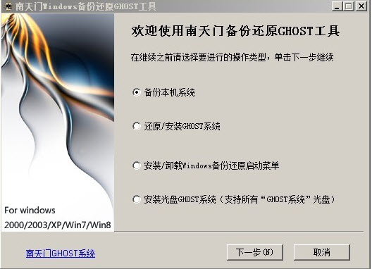 南天门Windows备份还原GHOST工具是Windows下备份还原软件,支持备份任意硬盘分区数据,任意硬盘分区数据还原,可安装到windows系统启动菜单,增加备份/还原选项,图形界面操作简单。支持XP/2003/WIN7/WIN8系统,支持64位Windows,支持所有GHOST系统光盘安装。