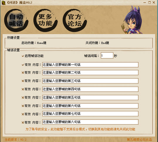 问道魔盒是一款可以在问道游戏中自动喊话,自动挤一线的辅助工具,更多功能正在开发中,本软件所有功能均为模仿键盘鼠标操作,绝非外挂。