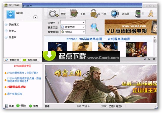 PP点点通2008 Beta 2.0 Build 0630 简体中文绿色免费版 PP点点通是基于P2P技术的中文文件交换和通讯软件,它可以让PP用户不通过服务器建立点对点的连接,直接进行文件交换、数据下载,共享硬盘资源以及即时聊天等。它的主要功能是:资源搜索、资源共享、下载和管理、好友查找、即时通讯、广告发布等。PP点点通是目前用户最多、影响力最大的中文P2P软件,运用这个软件,无论是MP3、图片、电影还是书籍、资料、软件,您都可以直接从PP上数百万其它用户的个人电脑中下载,就像在一个局域网中一样简单和方便