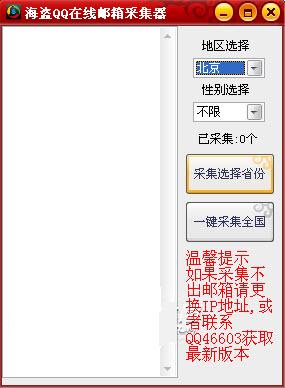 海盗QQ邮箱采集器是一个邮箱营销小工具!海盗QQ邮箱采集器可以采集各省份在线QQ邮箱地址,并且可以选择性别省份,也可以一键采集全国所有在线QQ邮箱地址操作简单适合营销的朋友使用!