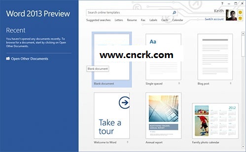 2、Office 2013中的新的开始屏幕显示了一系列的文档选项