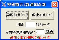 这是一款可以为神剑情天快速游戏加点的辅助工具。具有急速加点功能,设定好间隔时间,进入游戏后按下F1键即可开始飞速加点,方便玩家操作。 加到满意的数值后按下F2停止即可 。