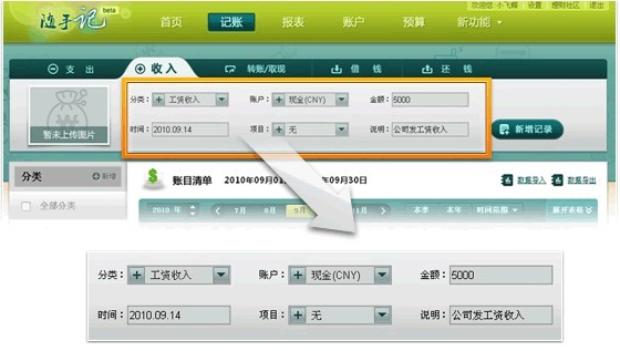 上班一族,每个月都会拿到一个月的工资,这时记在收入里面就可以了。在页签处选择收入,点击暂未上传图片即可上传你的工 资条,也可不必上传。分类处选择你收入分类,账户可选择的工资发放的形式,如银行卡或现金,录入金额5000元,时间选择你 领取工资的日子,项目可不填,在说明那里备注一下收入的来源说明,点击新增记录按钮即可记一笔收入