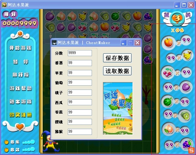 阿达水果派修改器 作弊功能: 分数修改 番薯数,葡萄数,桃子数,西瓜数,香蕉数目,樱桃数,猕猴数