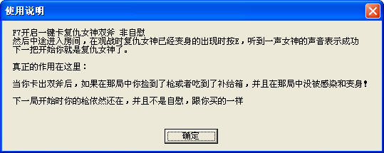 一键卡复仇女神双斧使用税用F7一键开启卡复仇女神双斧,然后中途进游戏,在观看复仇女神已经变身的时候按E,听到一声女神的声音表示成功。