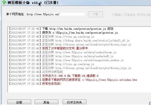 使用网页模板小偷软件,输入目标网页的网址,即可在本地生成对应文件夹保存整个网页,而且包含网页文件所用到的图片,css文件,js文件,css内的图片等.稍作手工修改,即可达到为您所用的目的,是您快速制站不可多得的助手。本软件为破解版,去掉了在线升级功能