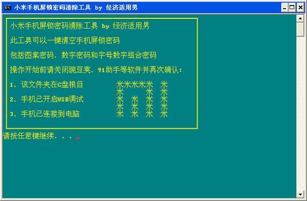 屏锁密码遗忘时可以采用次工具简单清除密码。 本人通过小米手机测试,MIUI2.3.5以及4.0都通用!! 其他手机没有测试,理论上可以通用。