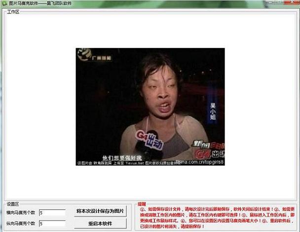 昊飞马赛克图片软件为本团队官方软件,本软件使用方便,直接处理,也可调整画笔大小,在工作区内,本软件还自动关变成工作笔鼠标模式,更有意见保存和重启软件模式!保存图片为当前流行的jpg格式,更加方便!更多功能,敬请发现~