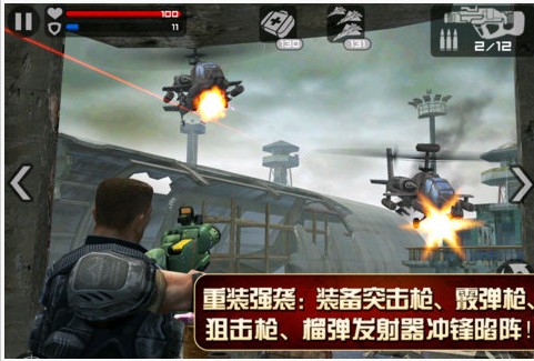 游戏采用终极第三人称射击视角,美轮美奂的画面,精准的控制操作以及先进的物理特性,加入日益白热化的战争,尽情享受IOS高清设备带给您的极限体验。从极易被摧毁的掩体向直升机、吉普车以及重兵把守的敌军基地发起进攻。在各种各样的任务中,击退一波又一波凶猛残暴的敌人。携带突击机枪、狙击枪、散弹枪、榴弹射器、火箭筒等枪械,及医药箱、盔甲和先进的电子设备奔赴前线。这款游戏支持在触屏智能机多样操控,既可点击屏幕中的虚拟按键以做出相应动作,也可以结合手势操作轻划屏幕转换视角。操作方便,在第一次使用时会有箭头指导。