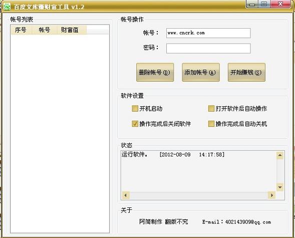 1.输入账号密码--》 点击“添加账号”--》 点击“开始赚钱” --》(会全自动操作评论百度文库文档和文辑,每天赚取10点财富值)。