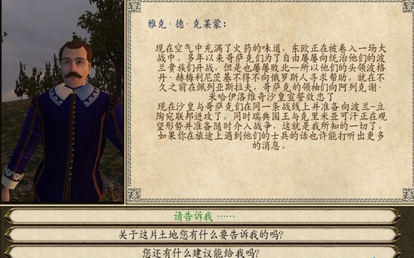 找到他以后,按到他的指示,叫你跟一些领主搞好关系,帮他们跑跑腿这样的小差事。提高你的声望,毕竟你什么都不是,别人叼都懒得叼你,跟贵族搞好关系,然后跟贵族说你希望得到一个特别的任务,他就会给你一封瑞典人进攻的线报,然后国王叫你去抓个瑞典的士兵。抓完之后要严刑拷打,最好过一个星期再去,要不然国王会说他还在翻译。一个星期里,你招兵买马的扩充兵力,然后再去找国王会说叫你去保护一个村庄,很简单的。把你部队里面能升级的尽量全部升级。然后国王叫你抓个瑞典的军官,这个很简单,我城堡里一大堆,随便拿个给他就行了。完成之后华沙就被占领了,完成之后国王叫你去打华沙,有点难度,之前招的并兵买的马,现在就有用了,一举拿下华沙。