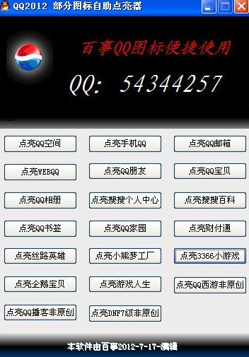 qq2012图标点亮器 qq2012图标点亮器可以帮助大家自动点亮qq空间、qq宝贝、丝路英雄、3366小游戏等图标,是一款集合了部分QQ图标点亮指引功能的绿色纯净辅助。