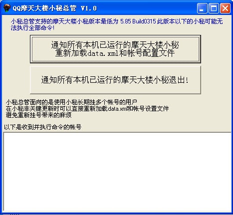 qq摩天大楼小秘总管是一款智能化的qq摩天大楼辅助软件,针对于使用小秘长期挂多个账号的用户哦,其特有的拉人算法可以用最短的时间帮您拉到经验最高的客人。qq摩天大楼小秘总管支持的摩天大楼小秘最低版本为5.85buil0315 ,低于此版本摩天大楼小秘总管可能无法运行。