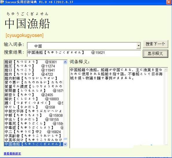 输入词语之后,点击搜索即可显示到对应词条的解释。输入时不需要输入完整词条即可模糊搜索。软件小巧实用,带有离线数据库,无需联网即可实用,搜索速度快,可以作为有一定日语能力的人查找新生词语的有力工具。