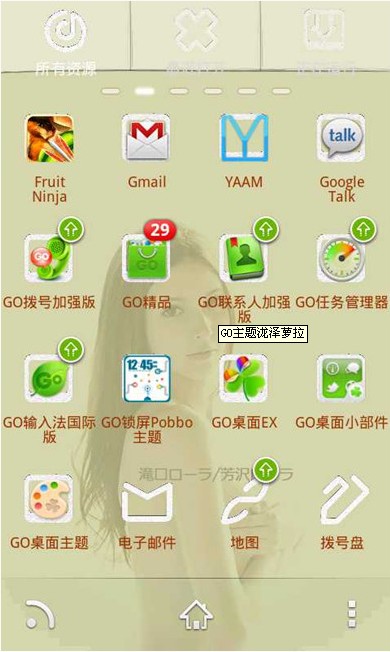 GO主题泷泽萝拉是针对GO桌面的主题而设计的一个主题桌面,喜欢的朋友可以下载试试,很不错的。亲测!漂亮!