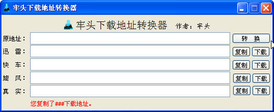 牢头下载地址转换器可转换地址有“迅雷”、“快车”、“旋风”“真实地址”。. 真实地址点击下载会直接调出IE下载保存窗口。点击下载可直接调出相应下载工具。(前提你必须安装了)
