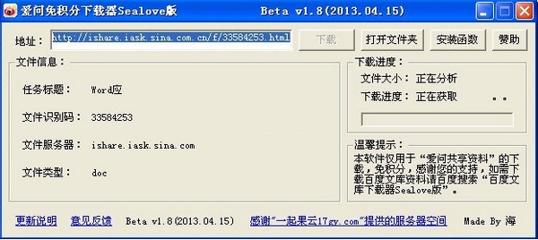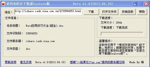 新浪爱问共享资料下载免积分工具是一款让你不用登录也不需要积分就可以下载新浪爱问中的共享资料的小工具,它非常实用,可以让你下载到许多你需要的资料。新浪爱问共享资料下载免积分工具能够免登陆、免积分下载新浪共享资料上的部分资源,特别是文档、图片、电子书等较小的文件。
