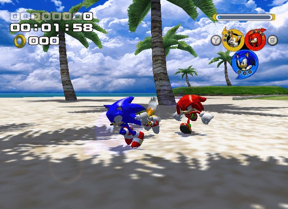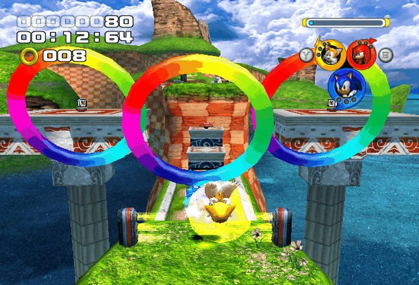 游戏中共有4组,一共12个角色,包括我们熟知的Sonic和他的朋友们,以及Sonic曾经的敌人。游戏继承了以往Sonic系列游戏的角色、道具盒、存档点、金环、分数、时间等基本元素,不过在此之上又做了许多改进和增添。首不同类型的角色由于优势能力不同具有不同的招式。Speed型的代表技为定点冲击(Homing Attack),瞄准敌人然后对其发动冲击;Fly型的代表技为雷霆射击(Thunder Shoot),将脚下队友踢出射击敌人,使敌人麻痹;Power型的代表技为火焰扣杀(Fire Dunk),将同伴蓄在手中然后砸向敌人。游戏还设有其他各式各样的招式和衍生招式,使进攻方式和游戏方式不再单调。