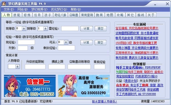 常用查询:包括最新奇经八脉模拟系统,科举试题,三界答题,法宝模拟,元宵灯谜,诗中仙,子女教导,四门绝阵,帮派迷宫,三界书院,钓鱼查询,NPC查询,聊天表情,梦幻卡牌,技能花费,传说地点,等数据查询功能。