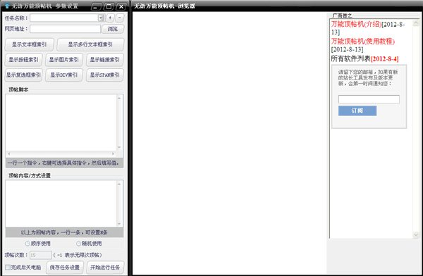 无语万能顶帖机是一款自动顶贴工具,各大论坛,网页升级必备工具。无语万能顶帖机功能非常简单:任意网页顶帖,回复,评论,留言。无语万能顶帖机支持最小化后台发送,不影响电脑操作。软件可多开,实现多任务执行。