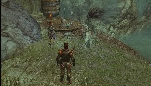 这个任务非常值得推荐,虽然解这个支线任务非常复杂,不过这个任务的敌人数量够多,跑完整个任务至少可以升个二级没有问题。想要进入这个神秘的神殿前,玩家必须先从Orobas Fjords的港口对面进来,那里会有一个散发蓝光的传送点。进来之后玩家会被传送到Orobas Fjords以外的场景,一开始玩家必须化身为龙把上方的弩炮都给打坏,玩家特别要注意飞上去后会有很多发射雷电的防御塔,如果没有尽快把它处理掉的话,很容易就会遭到持续型的伤害。从最上层堡垒的传送点进来,玩家会来到图示中的这个神殿,走进去一点就能看到一位女性鬼魂站在那里,与她交谈后就能接到Close to the Bone,这个任务主要是需要玩家解救鬼魂的老公,但他们夫妻一直被困在这里无法离开,希望主角能够帮助他们。