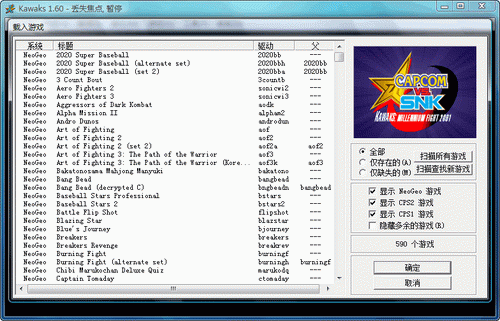 选择"现有游戏"单选钮,然后单击"重新扫描所有游戏"按钮看看你有多少游戏可以玩,如果你还没有游戏Roms,到各大模拟站去下吧,具体网址最后介绍.下载完成后把它放到WinKawaks根目录的ROMS目录中,如果没有这个目录,新建一个吧。