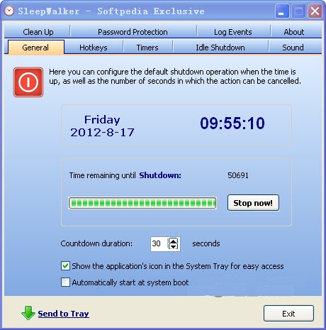 SleepWalker 1.0.0.1 官方版 若想要节约电脑的电源使用,习惯免不了要做些改变,例如随手关闭电脑萤幕、周边设备不使用时,关闭电源等等,但若想在一段的时间后可以自动关闭电脑,定时器应该会是很好的应用,SleepWalker 除了可以让你自订要关机、重新啟动、休眠、登出、关闭电脑萤幕、啟用应用程式等动作的时间外,SleepWalker 还提供 Idle Shutdown 功能,让你可以自订在滑鼠多久时间都无动作时,就自动关机。