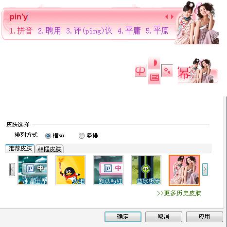 与大多数拼音输入法一样,QQ拼音输入法支持全拼、简拼、双拼三种基本的拼音输入模式。而在输入方式上,QQ拼音输入法支持单字、词组、整句的输入方式。基本字句的输入操作方面,QQ拼音输入法与常用的拼音输入法无太大的差别。它默认显示五个候选字,以横向的方式呈现;最多可同时显示九个候选字,可以改变为纵向显示候选字,这给原来使用智能ABC一类输入法的用户带来了方便。QQ拼音输入法在词库方面表现:
