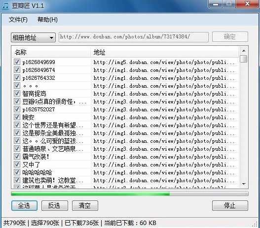 2012-08-12 发布豆瓣匠 V1.1版本。修复原1.1版本Bug,增加相册下载功能,支持图片说明下载,自动生成简单的HTML图片列表,。增加图片、音乐分开保存功能。