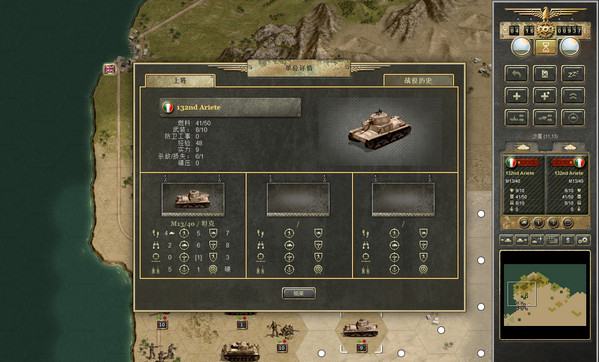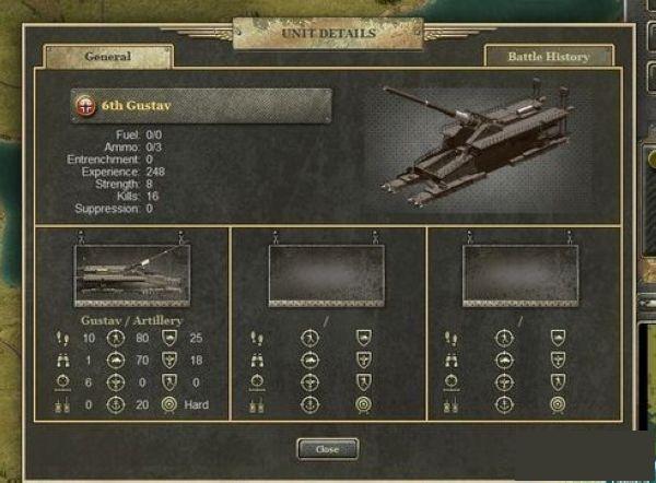 游戏的一些具体特点如下: 400种游戏单位由19大类武器类别和21种升级部件组成,17种地形和所有天气类别对战争进程影响巨大; 26大战役根据玩家的不同表现将呈现树状进程,微弱胜利和重大胜利对战局是有影响的; 包含二战中主要的欧洲国家加上美国,共超过14个,每个国家的作战单位有区别; 作战部队有详细的数据描述,弹药,燃料,经验,士气,机动力,视野等等,可以升级武器,可以补给,部队经验值可带入下一关,每个部队有作战经历描述,甚至可以产生英雄指挥官(好像对部队有加成作用,不确定)【游戏秘籍】