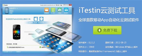 iTestin云测试工具是一款覆盖Android和iOS两大设备平台的免费自动化测试的工具,为移动应用开发者提供安全的黑盒测试环境。它所包含的测试服务类型 有功能测试、UI测试、性能测试、稳定性测试、安全测试和竞争测试,返回包括日志和截图的详细测试报告, 帮助开发者快速找到错误原因,提升应用质量,获取更多用户和收入。