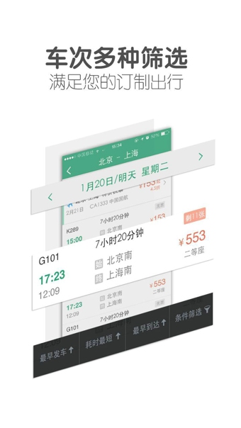 超级火车票(Ticket Searching)与铁道部官网同步,支持手机预订火车票!支持火车余票、时刻表、停靠车站、票价、火车票代售点等各种火车信息查询功能。