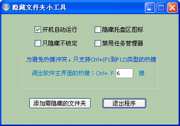 晨风隐藏文件夹小工具是一款安全绿色,快速简便,轻量级的文件夹隐藏工具,在不对文件有任何改动和加密的前提下,它能尽最大可能帮助你隐藏文件。