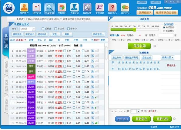 智胜足彩北单过滤软件是国内首创,技术领先,唯一足彩第二代软件,业内最优数据库支持,数据最全,最准确;全智能化一键式过滤,不懂足彩者也可使用,一分钟完成做单,省时,省力;多种玩法、多种盈利模式选择,提高中奖率,轻松中大奖;方便安全,派奖,提款迅速到账。